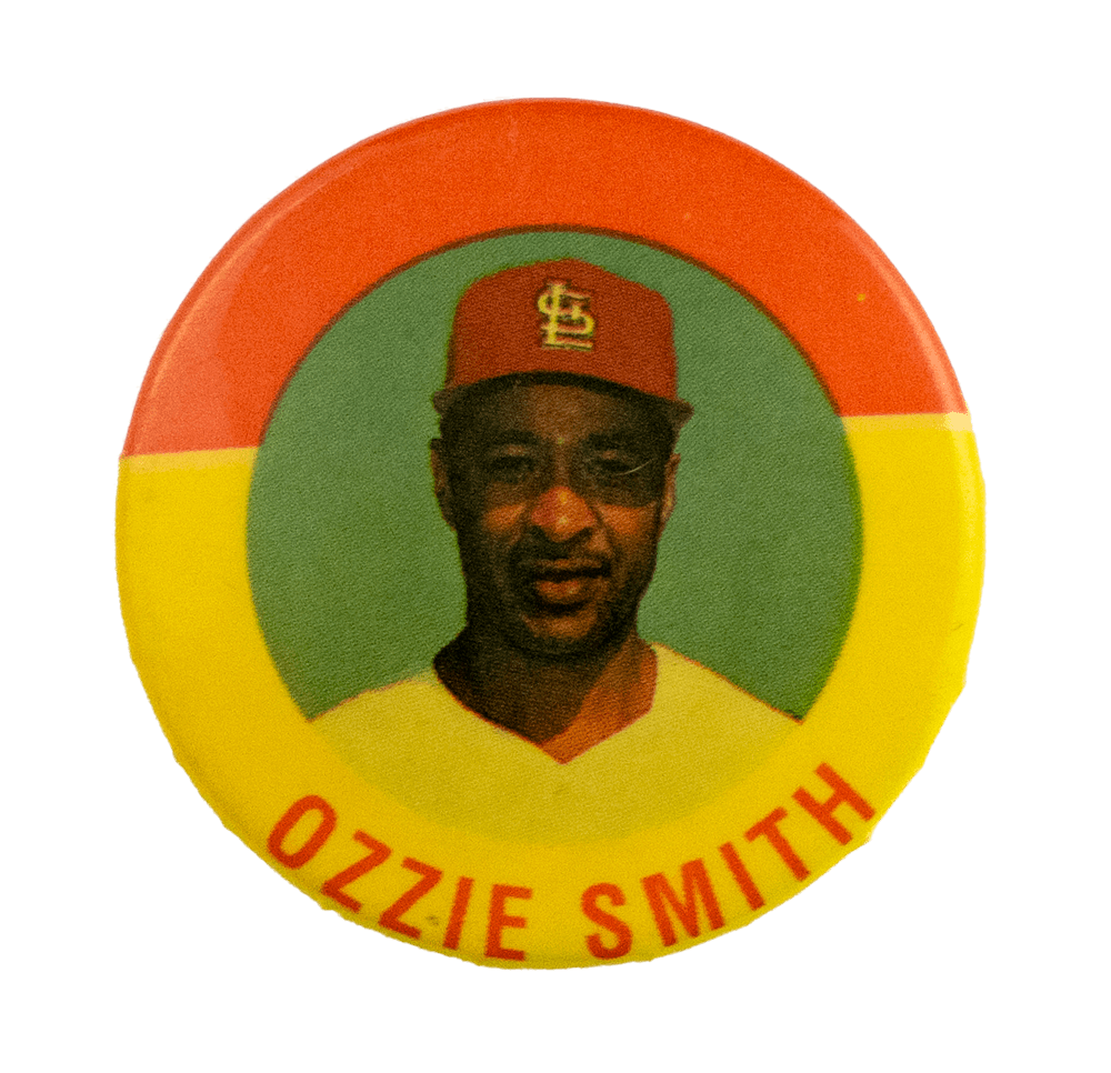 Image Description | Green background with orange around the top rim, yellow with orange text around the bottom, and color photograph of baseball player Ozzie Smith wearing a red cap in the center |