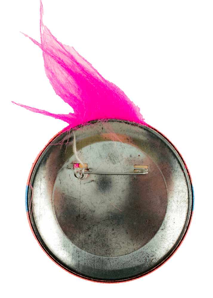 | Image Description | Illustration of the head of a pink-haired Troll doll in the center on a white background over a horizontal blue band with two white stars on either side of the troll; black text is on the top and bottom with a red band around the rim; pink troll doll hair is attached to the top of the button |