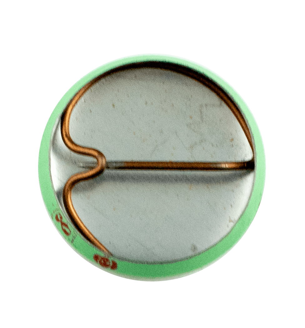 | Image Description | Dark red text around the rim and along the sides on a mint green background. Two concentric red circles surround a text and a simple illustration of the United States and Canada in the center of the button. |