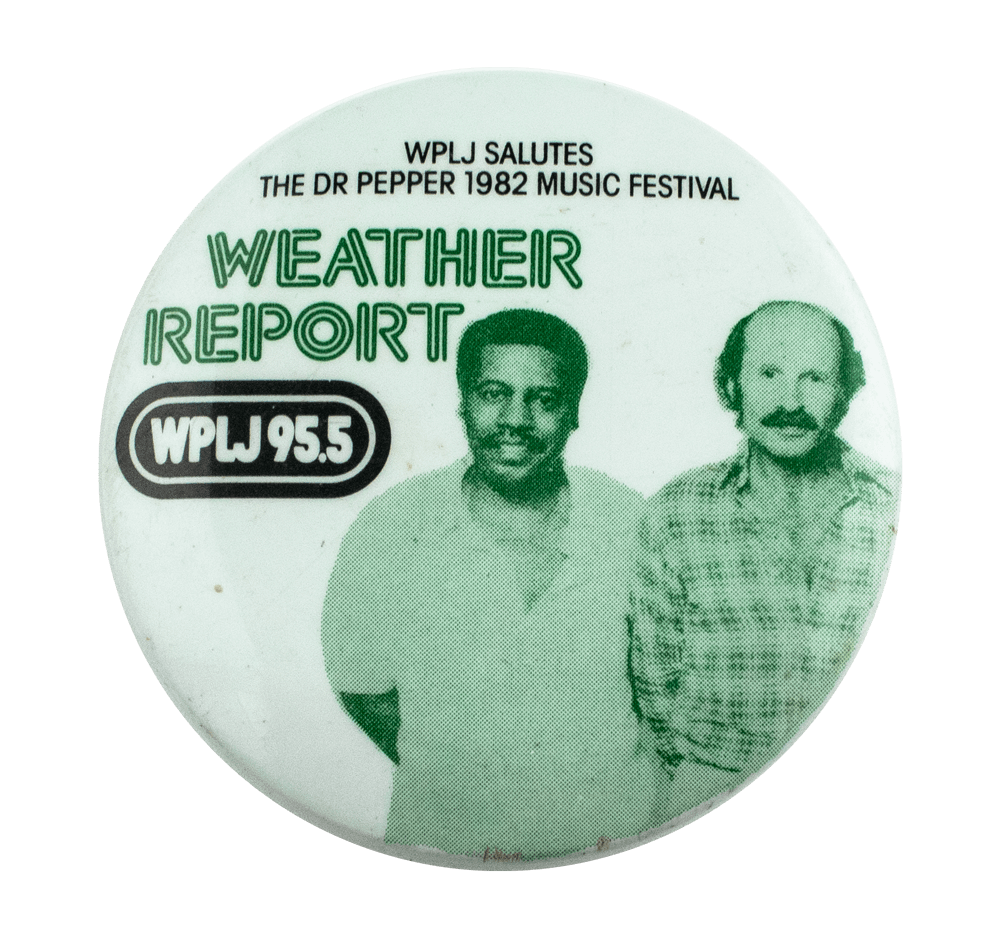 | Text on Button | WPLJ SALUTES THE 1982 DR. PEPPER MUSIC FESTIVAL WEATHER REPORT WPLJ 95.5 |